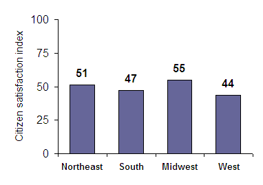 Note: The Citizen Satisfaction Index is composed of three questions designed to track overall citizen satisfaction with the performance of local government. The scale ranges from 0 to 100.